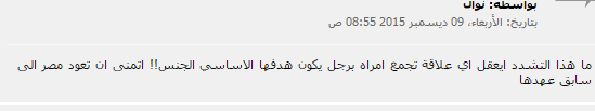 – نوال: “ما هذا التشدد أي عقل؟ أي علاقة تجمع إمرأة برجل يكون هدفها الأساسي الجنس!! اتمنى أن تعود مصر إلى سابق عهدها”.