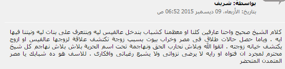 • شريف: “كلام الشيخ صحيح واحنا عارفين كلنا أو معظمنا كشباب بندخل عالفيس ليه وبنتعرف على بنات ليه ونيتنا فيها ايه، وياما حصل حالات طلاق في مصر وخراب بيوت بسبب زوجة تكتشف علاقة لزوجها عالفيس أو الزوج يكتشف خيانه زوجته، اتقوا الله وبلاش نحارب الحق ونهاجمه تحت اسم الحرية بلاش بلاش نهاجم كل شيخ محترم لمجرد إن فتواه أو رأيه لا يرضى نزواتى ولا يشبع رغباتي وأفكاري”.