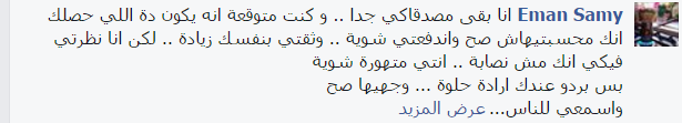 Eman Samy: أنا بقى مصدقاكي جدًا.. وكنت متوقعة انه يكون دة اللي حصلك انك محسبتيهاش صح واندفعتي شويه، .. وثقتي بنفسك زيادة .. لكن أنا نظرتي فيكي انك مش نصابة.. انتي متهورة شوية.. بس بردو عندك ارادة حلوة… وجهيها صح”.