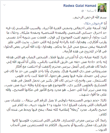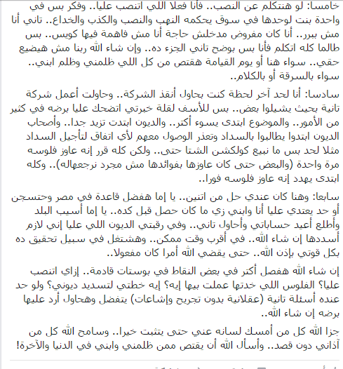 وأكدت “جلال” أنها ستفصل في بعض النقاط عبر منشورات قادمة، كيف تم النصب عليها، وما مصير الأموال التي معها، وما خطتها لتسديد الديون، والإجابة على كل من لديه أسئلة.