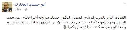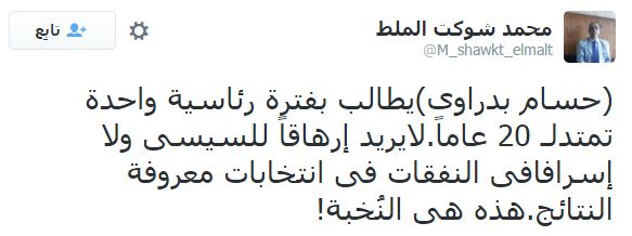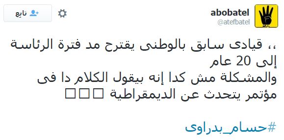 بينما كتب أبوحسام البخاري: “القيادي البارز بالحزب الوطني المنحل الدكتور حسام بدراوي أخيرا تخلى عن صمته الطويل وخرج ليقول: أطالب بتعديل مدة حكم رئيس الجمهورية لتكون 20 سنة مرة واحدة! بدراوي سكت دهرا ونطق كفرا”.