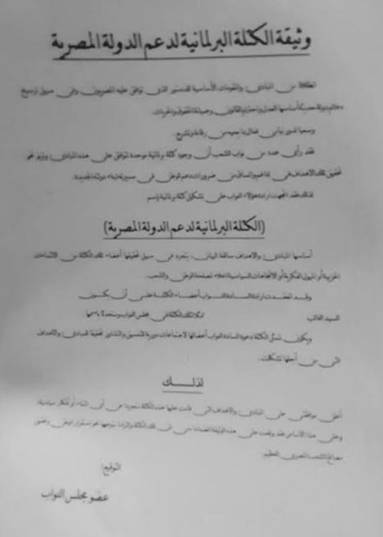 وحصلت “رصد” على نسخة من وثيقة الكتلة البرلمانية لدعم الدولة المصرية، والتي يوقعها العضو كإقرار بالانضمام لتلك الكتلة وإعلان تأييده لقراراتها متجردا من أي انتماء أو أفكار سياسية.