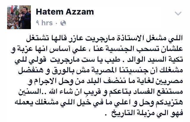 وعلق البرلماني السابق، حاتم عزام، على تصريحات مارجريت عازر: “اللي مشغل الأستاذة مارجريت عازر قالها تشتغل علشان تسحب الجنسية عنا، على أساس إنها عزبة وتكية السيد الوالد”.