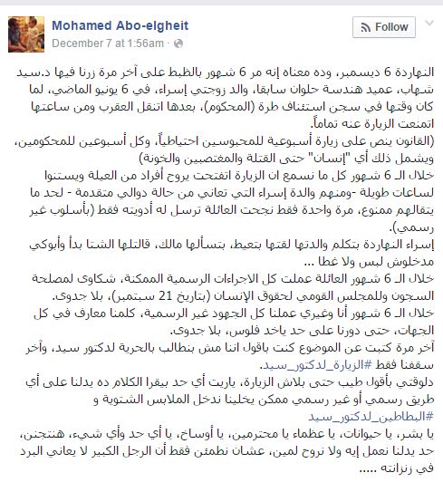 ولفتت سيف في منشورها الذي انتشر بشكل واسع على “فيسبوك” إلى أنّها علمت من بعض الضباط الآخرين أنّ “كيرلس” يكره الثورة المصرية، وعندما علم أنّها من الثوار وأخت الناشط علاء عبدالفتاح، وأنّها تكره التعذيب وتنشط ضدّه، قرر أن “يُضايقها” بتعذيب الآخرين، لأنّ أوامر وصلت للضابط بعدم المسّ بها.