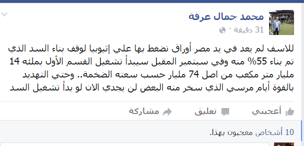 وقال “عرفة” -عبر منشور له على “فيس بوك”-: “للأسف لم يعد في يد مصر أوراق تضغط بها علي إثيوبيا لوقف بناء السد الذي تم بناء 55% منه وفي سبتمبر المقبل سيبدأ تشغيل القسم الأول بملئه بـ14 مليار متر مكعب من أصل 74 مليار حسب سعته الضخمة”، مشيرًا إلى أنه “حتى التهديد بالقوة أيام مرسي الذي سخر منه البعض لن يجدي الآن لو بدأ تشغيل السد”.