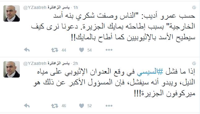 وأضاف “الزعاترة” ساخرًا -في تغريدة أخرى- “إذا ما فشل السيسي في منع العدوان الإثيوبي على مياه النيل، ويبدو أنه سيفشل، فإن المسؤول الأكبر عن ذلك هو ميكرفون الجزيرة!!!”.