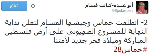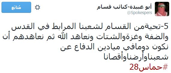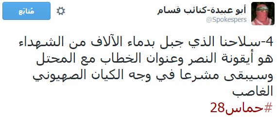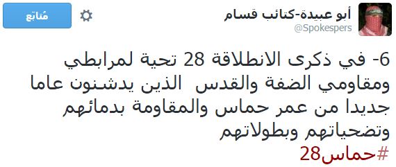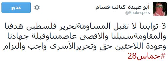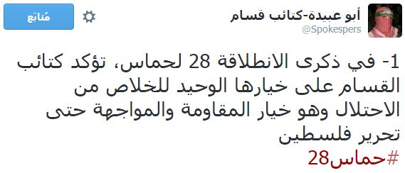 وقال أبوعبيدة في تغريدة له عبر حسابه الرسمي على موقع التواصل الاجتماعي “تويتر”، بمناسبة احتفال حماس بمرور 28 عامًا على انطلاقها: “في ذكرى الانطلاقة 28 لحماس، تؤكد كتائب القسام على خيارها الوحيد للخلاص من الاحتلال وهو خيار المقاومة والمواجهة حتى تحرير فلسطين”.