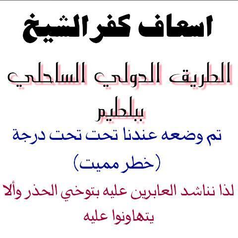 رفع مرفق إسعاف كفر الشيخ تصنيف الطريق الدولي الساحلي المار بمحافظة كفرالشيخ إلي تصنيف " خطر مميت " بعد تزايد نسبة الحوادث علي الطريق بشكل غير مسبوق