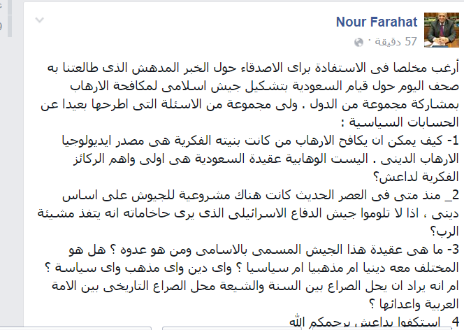 أعرب الفقيه الدستوري، نور فرحات، عن دهشته من قيام السعودية بتشكيل جيش إسلامي لمكافحة الإرهاب، بمشاركة مجموعة من الدول؛ حيث طرح -عبر صفحته على موقع التواصل الاجتماعي “فيس بوك”- مجموعة من الأسئلة بعيدًا عن الحسابات السياسية، بحسب ما قال وهي: