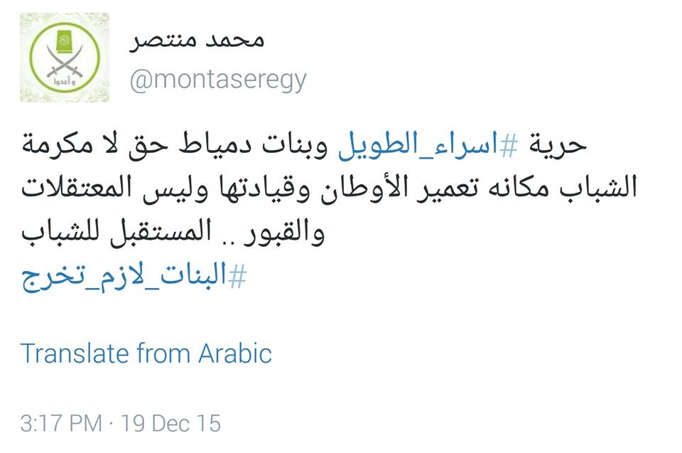 -محمد منتصر، المتحدث الإعلامي باسم جماعة الإخوان المسلمين: “حرية #اسراء_الطويل وبنات دمياط حق لا مكرمة .. الشباب مكانه تعمير الأوطان وقيادتها وليس المعتقلات والقبور .. المستقبل للشباب”.