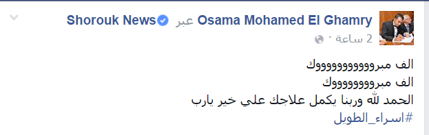 Osama Mohamed El Ghamry- :”الف مبروووووووووووك الف مبرووووووووك الحمد لله وربنا يكمل علاجك علي خير يارب”.