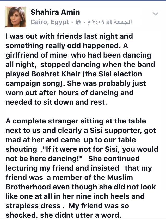 وأضافت “كانت صديقتي فقط متعبة بعد ساعات من الرقص المتواصل وكانت هناك امرأة مؤيدة للسيسي تجلس بجوارنا جن جنونها وأتت إلى طاولتنا تصرخ: “لو أنك من مؤيدي السيسي لما توقفت عن الرقص” وأعطتها محاضرة وكان لديها إصرار على أنها من الإخوان المسلمين على الرغم من أن صديقتي لا تبدو كذلك؛ حذاؤها ذو كعب عالٍ يبلغ طولة 9 سم وفستان عاري الكتف.. ولم تتكلم صديقتي بكلمة”.