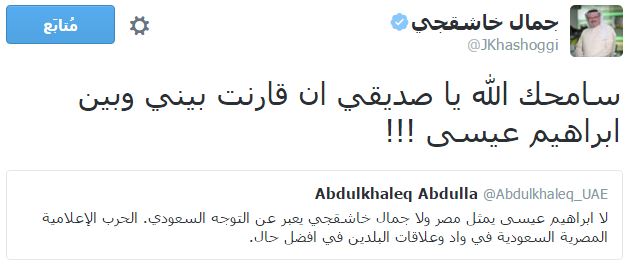 وكان الأكاديمي الإماراتي، عبدالخالق عبدالله، مستشار ولي عهد أبوظبي، غرد قائلاً: “الإعلامي إبراهيم عيسى لا يمثل الموقف المصري، وأيضا الكاتب السعودي جمال خاشقجي لا يعبر عن التوجه السعودي”.