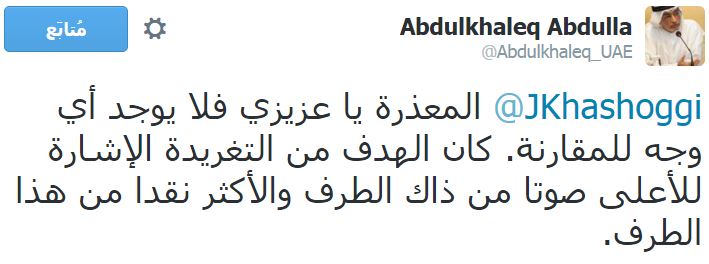 وعقب تعليق خاشقجي على تغريدة عبدالخالق عبدالله، علق قائلًا: “المعذرة يا عزيزي فلا يوجد أي وجه للمقارنة كان الهدف من التغريدة الإشارة للأعلى صوتا من ذاك الطرف والأكثر نقدا من هذا الطرف”.