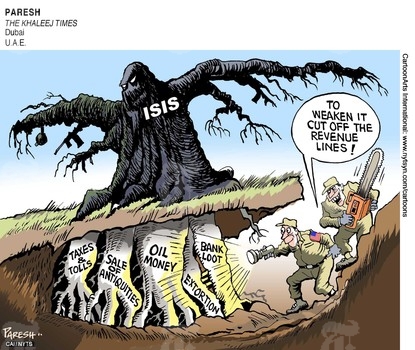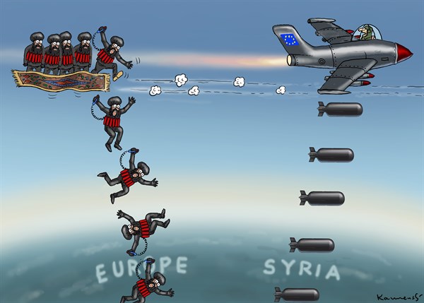 ونشر موقع “بولتيكال كارتونز” رسما ساخرا من الإرهاب الدولي الذي يقوم به كل من تنظيم الدولة والاتحاد الأوروبي في سوريا.