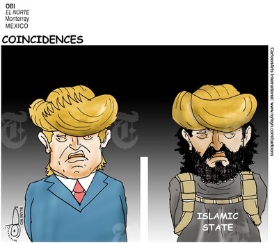 نشرت “نيويورك تايمز” هذا الرسم ساخرة من إرهاب دونالد ترامب المرشح الأميركي مقارنة بإرهاب تنظيم الدولة.