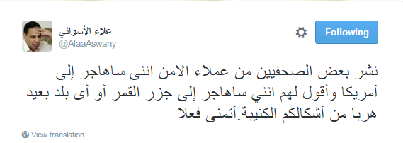 وكتب “الأسواني” تغريدة على موقع التواصل الاجتماعي “تويتر” قال فيها: “نشر بعض الصحفيين من عملاء الأمن أنني سأهاجر إلى أميركا، وأقول لهم إنني سأهاجر إلى جزر القمر أو أي بلد بعيد هربًا من أشكالكم الكئيبة”.