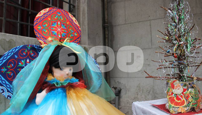 ووضع المنظمون مجسما لعروسة المولد ترميزا للمولد النبوي الشريف، وبجوارها شجرة “الكريسماس” التي ترمز لرأس السنة الميلادية وميلاد المسيح.