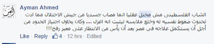 ونفى “أيمن” أن يكون الشاب الفلسطيني مختلًا عقليًا، موضحًا أنه كان مصابًا أراد العلاج في مصر، يأس من طول الانتظار على معبر رفح، وتعمد خلع ملابسه ليثبت أنه أعزل.