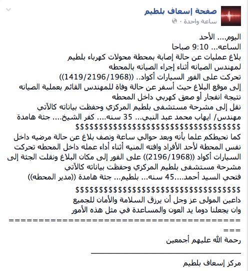 وقالت صفحة إسعاف بلطيم على الـ”فيس بوك”: اليوم الأحد الساعة.. 9:10 صباحًا تم الإبلاغ عن إصابة بمحطة محولات كهرباء بلطيم لمهندس الصيانة أثناء إجراء الصيانة بالمحطة تحركت على الفور السيارات أكواد (1419/2196/1968) إلى موقع البلاغ؛ حيث أسفر عن حالة وفاة للمهندس القائم بعملية الصيانة نتيجة انفجار أو صعق كهربائي داخل المحطة ونقل إلى مشرحة مستشفى بلطيم المركزي وحفظت بياناته كالآتي: مهندس إيهاب محمد عبدالنبي “35 سنة”.. كفر الشيخ.. جثة هامدة.