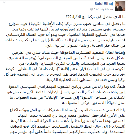 وأضاف “الحاج”، “هناك حالة تصعيد عسكري ملحوظة؛ حيث هناك قتلى في الطرفين بشكل شبه يومي، فيما اتخذ “مجلس المجتمع الديمقراطي” (وهو مظلة تنضوي تحتها العديد من المؤسسات والتيارات الكردية اليسارية والمقربة من الكردستاني في الغالب) قراراً بدعم إقامة “إدارات ذاتية” في المناطق الكردية، وقد دعم حزب الشعوب الديمقراطي هذا التوجه، بل دعا إلى تعميمه في كل تركيا وليس فقط في المناطق ذات الأغلبية الكردية.