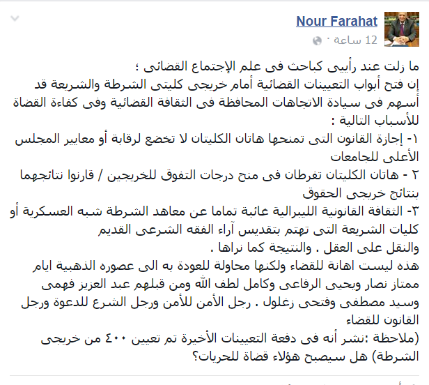أكد الفقيه القانوني الدكتور نور فرحات، أن فتح أبواب التعيينات القضائية أمام خريجي كليتي الشرطة والشريعة، قد أسهم في سيادة الاتجاهات المحافظة في الثقافة القضائية، وفي كفاءة القضاة.