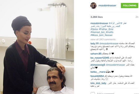 نشرت “الشيخة موزة بنت ناصر” زوجة أمير دولة قطر السابق الشيخ حمد بن خليفة آل ثان، صورًا لها عبر موقع “انستجرام” برفقة زوجها عقب إجرائه عملية جراحية ناجحة في مدينة زيورخ السويسرية.