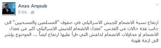 وأوضح أبوعرقوب في تدوينة له عبر حسابه الشخصي على موقع التواصل الاجتماعي “فيس بوك”: “ارتفاع نسبة الانضمام للجيش الإسرائيلي في صفوف “المسلمين والمسيحيين” إلى جانب عدة حالات من القدس.. معدل الانضمام للجيش الإسرائيلي أكبر من معدل الانضمام أو محاولات الانضمام لداعش التي طرأ عليها ارتفاع أيضا.. الموضوع يؤشر إلى أزمة هوية”.