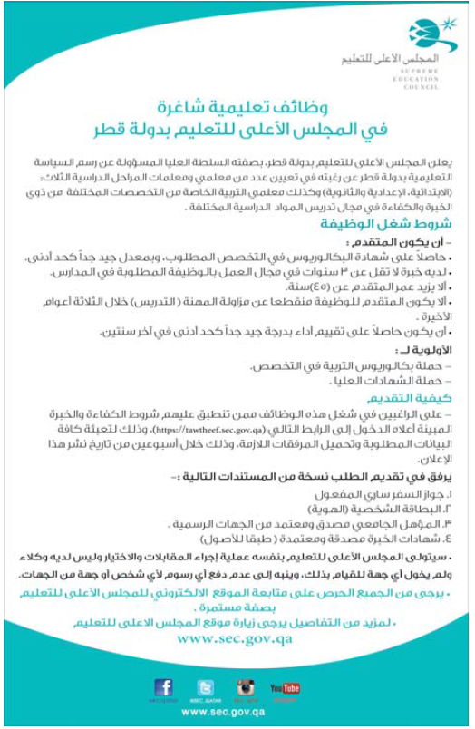 وجاء في الإعلان أن دولة قطر تطلب مدرسين لجميع مراحل التعليم “الابتدائية والإعدادية والثانوية”، موضحًة أنه يمكن التقدم على الإنترنت من خلال تسجيل طلب الحصول على وظيفة بالمجلس الأعلى للتعليم بقطر.