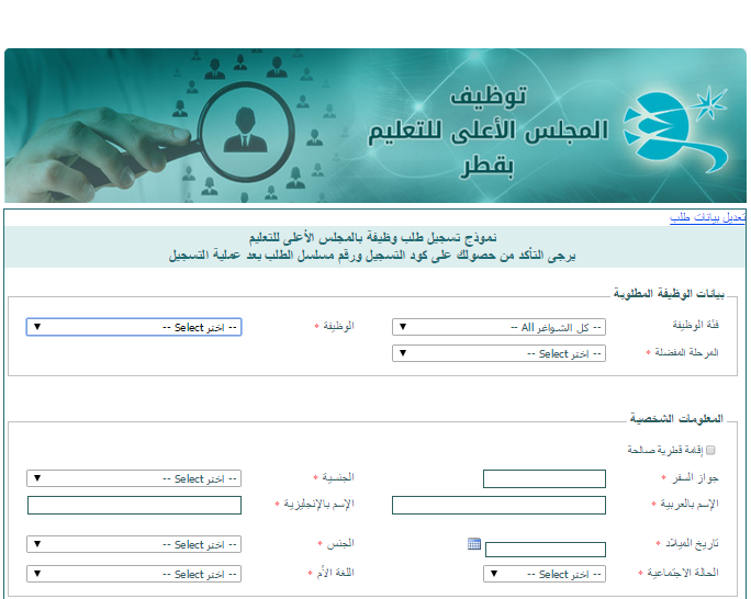 أعلن المجلس الأعلى للتعليم بدولة قطر عن فتح باب التسجيل لوظائف بالمجلس لعام 2016. حيث يمكن للمدرسين الراغبين في العمل بدولة قطر ملء بيانات نموذج تسجيل طلب وظيفة بالمجلس الأعلى للتعليم.