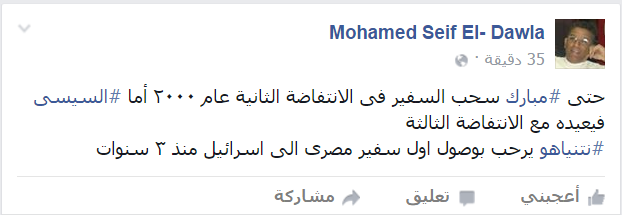 وقال “سيف الدولة”- عبر منشور له على “فيسبوك”-: “حتى مبارك سحب السفير في الانتفاضة الثانية عام ٢٠٠٠ أما السيسي فيعيده مع الانتفاضة الثالثة”.