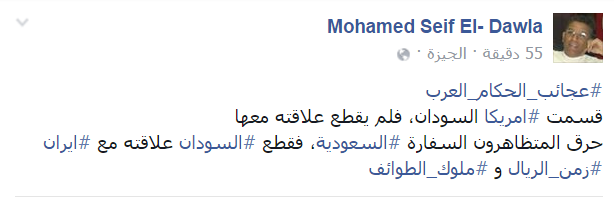 وقال “سيف الدولة” -في منشور له على “فيس بوك”-: “قسمت أميركا السودان، فلم يقطع علاقته معها.. حرق المتظاهرون السفارة ‫‏السعودية، فقطع السودان علاقته مع إ‏يران”، مختتمًا منشوره بهاشتاجي ‫#‏زمن_الريال و‫#‏ملوك_الطوائف.