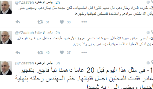 قال “الزعاترة” -عبر عدة تغريدات على “تويتر”-: “في مثل هذا اليوم قبل 20 عامًا داهمنا نبأ فاجع، بتفجير غادر فقدت فلسطين أجمل فتيانها”.