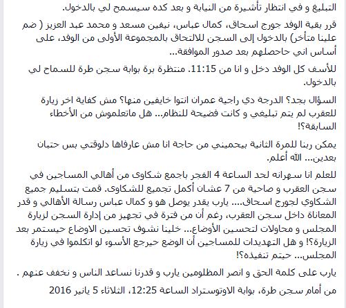 وأوضحت أن أعضاء المجلس قرروا الدخول للسجن لمباشرة مهامهم، وظلت هي منتظرة خارج السجن، وأنها سلمت جميع الشكاوى اللي كانت بحوزتها لجورج إسحاق للتحقق منها أثناء الزيارة التي منعت من دخولها.