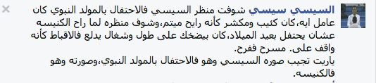 وقال حساب آخر: “شوفت منظر السيسي في الاحتفال بالمولد النبوي كان عامل ايه، كان كئيب ومكشر كأنه رايح ميتم، وشوف منظره لما راح الكنيسة عشان يحتفل بعيد الميلاد، كان بيضحك على طول وشغال يدلع في الأقباط كأنه واقف على مسرح في فرح”.