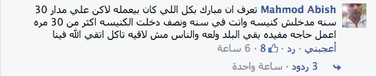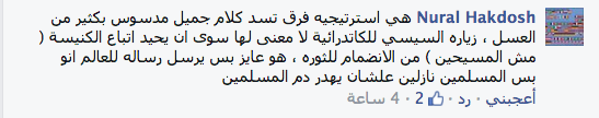 وشارك أحد رواد “فيس بوك” قائلًا: “هي إستراتيجية فرق تسد كلام جميل مدسوس بكثير من العسل، زيارة السيسي للكاتدرائية لا معنى لها سوى أن يحيد أتباع الكنيسة (مش المسيحيين) من الانضمام للثورة، هو عايز بس يرسل رسالة للعالم انو بس المسلمين نازلين علشان يهدر دم المسلمين”.