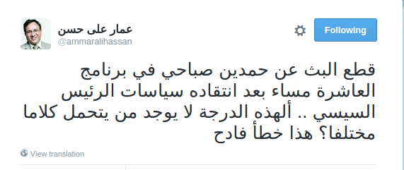 واستنكر الدكتور عمار علي حسن، الباحث في علم الاجتماع السياسي، قطع البث عن حمدين صباحي، أثناء استضافته، قائلًا: “قطع البث عن حمدين صباحي في برنامج العاشرة مساءً بعد انتقاده سياسات الرئيس السيسي” على حد وصفه.