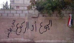 ويتعاون حزب الله مع النظام السوري في حصار سكان مضايا واستخدامها كورقة ضغط علي المقاومة؛ حيث تداول نشطاء جملة كتبت على أحد الجدران في المدينة: “الجوع أو الركوع”، والتي كتبت من قبل جنود الأسد وحزب الله.