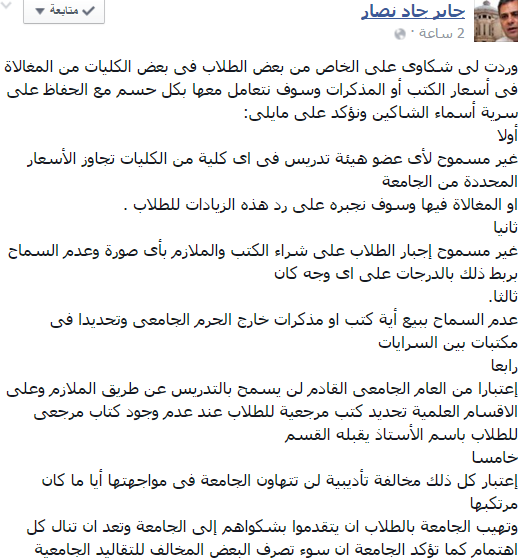 وقال -عبر منشور له على “فيسبوك”-: “وردت لي شكاوى على الخاص من بعض الطلاب في بعض الكليات من المغالاة في أسعار الكتب أو المذكرات، وسوف نتعامل معها بكل حسم مع الحفاظ على سرية أسماء الشاكين”.
