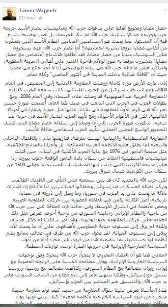 وأضاف “وجيه” -في منشور له على صفحته بموقع التواصل الاجتماعي “فيس بوك”- “حصار مضايا وتجويع أهلها على يد قوات حزب الله ومليشيات بشار الأسد جريمة حرب وجريمة ضد الإنسانية، حزب الله لم ينكر الجريمة، بل أصدر توضيحًا يشرح فيه أن المسؤول عما يحدث هو المسلحون المعادون لنظام الأسد الذين يتخذون من أهالي مضايا دروعًا بشرية لحمايتهم!!”.