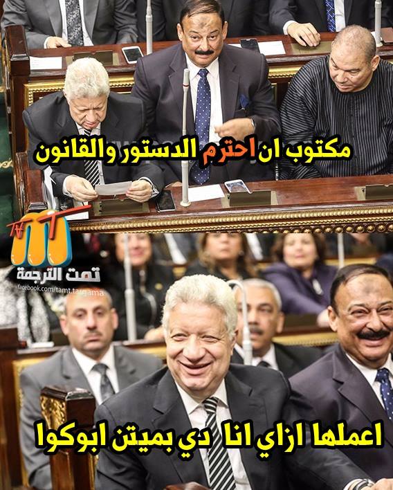 وعلق محمد محمود أن قسم مرتضى منصور سيكون: “أقسم بالله العظيم أن أحافظ على ديك أم الوطن وأن أرعى مصالح ميتين أم الشعب وأحافظ على ميتين أم أراضيه”.