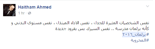 وأضاف الناشط هشام أحمد “نفس الشخصيات المثيرة للجدل، نفس الأداء المبتذل، نفس مستوى التدني وكأنه برلمان مدرسة.. نفس السيرك بس بقرود جديدة”.