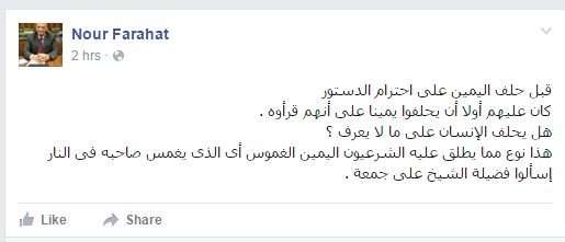 وقال “فرحات” -في منشور له على صفحته بموقع التواصل الاجتماعي “فيس بوك”-: قبل حلف اليمين على احترام الدستور، كان عليهم أولًا أن يحلفوا يمينًا على أنهم قرءوه”، متسائلًا: “هل يحلف الإنسان على ما لا يعرف؟، هذا نوع مما يطلق عليه الشرعيون اليمين الغموس أي الذي يغمس صاحبه في النار”، مضيفًا “اسألوا فضيلة الشيخ علي جمعة”.