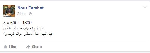 وسخر “فرحات” من أداء القسم في منشور آخر قائلًا: “3×600= 1800، عدد أيام الصيام بعد حلف اليمين، فهل تقيم أمانة المجلس موائد الرحمن؟”.