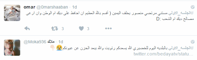 دشن رواد موقع التواصل الاجتماعي “تويتر” هاشتاجا تحت عنوان “الجلسة الأولى” وذلك عقب بدء انطلاق أولى جلسات برلمان 2015 اليوم.