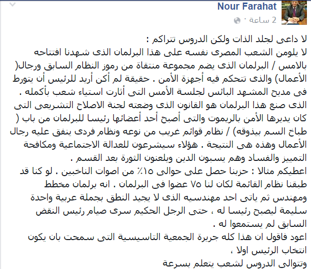 وتابع “فرحات”: النظام الذي تم تشكيل البرلمان على أساسه، نظام قوائم غريب من نوعه ونظام فردي ينفق عليه رجال الأعمال وهذه هي النتيجة.. هؤلاء سيشرعون للعدالة الاجتماعية ومكافحة التمييز والفساد وهم يسبون الدين ويلعنون الثورة بعد القسم”.
