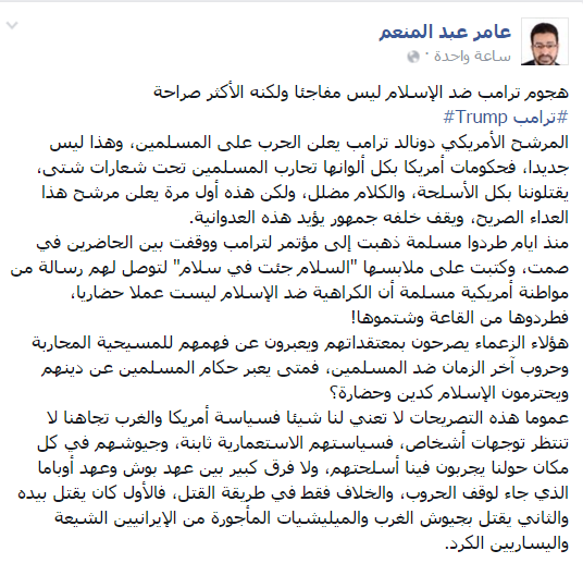 وأضاف “عبدالمنعم” في منشور له على حسابه في موقع “فيس بوك”: “منذ أيام طردوا مسلمة ذهبت إلى مؤتمر لترامب ووقفت بين الحاضرين في صمت، وكتبت على ملابسها “السلام جئت في سلام” لتوصل لهم رسالة من مواطنة أمريكية مسلمة أن الكراهية ضد الإسلام ليست عملا حضاريا، فطردوها من القاعة وشتموها!”.