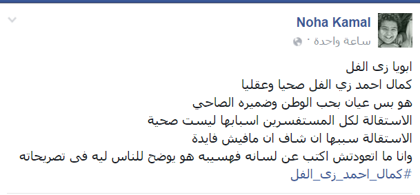 وقالت نهى كمال -عبر منشور لها على “فيس بوك”-: “أبويا زي الفل، كمال أحمد زي الفل صحيًا وعقليًا، هو بس عيان بحب الوطن وضميره الصاحي”.