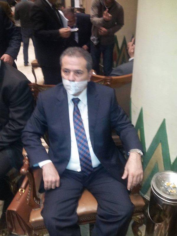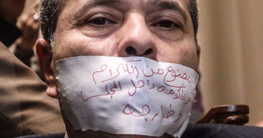 وكتب “عكاشة” على الشريط اللاصق الموضوع على فمه: “ممنوع من الكلام داخل المجلس وخارجه بأمر الحكومة”.