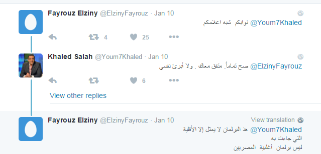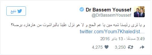 وكان الكاتب الصحفي خالد صلاح، رئيس تحرير صحيفة “اليوم السابع”، قد نشر تغريدة ساخرة تساءل فيها عما “إذا كان شعب مصر من الملائكة حتى يطلب برلمانًا من الجنة أو نوابًا من هارفارد”، ليرد عليه باسم يوسف بتغريدة أثارت الكثير من التعليقات.